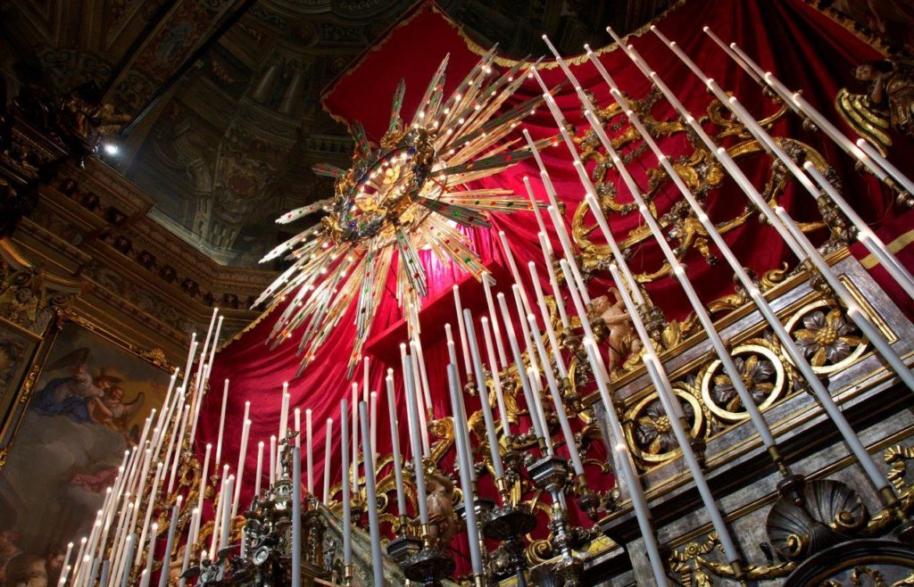 L’uso della luce è certamente uno degli elementi più importanti per il Triduo. Contemplare le vivaci fiammelle tremolanti nell’austera penombra della Basilica disposte a salire fino al cuore della raggiera era sicuramente toccante. Cristo. Luce del mondo, irradia dal Paradiso il suo calore di cui ogni singola fiamma e quindi ogni cristiano diviene riflesso.